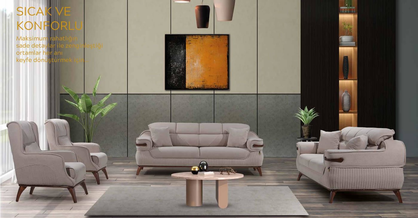 Ürün içeriği: 3 + 3 + 1 + 1 takımdan oluşmaktadır. | Ürün iskeleti: Gürgen, Kavak, Kontraplak dır. Kumaş Bilgisi: Yönsüz Kadife, Babyface, Keten, Nubuk vb. İsteğe bağlı kumaştan yapılabilir, fiyat farkı ödemesi yapılaraktan. Tüm renk seçenekleri mevcuttur. Sünger: 28 Dansity Soft sünger kullanılmıştır. | Sırttan yatırmalı yatak olma özelliğine sahiptir. Ayaklar: Plastik & Metal & Ahşap