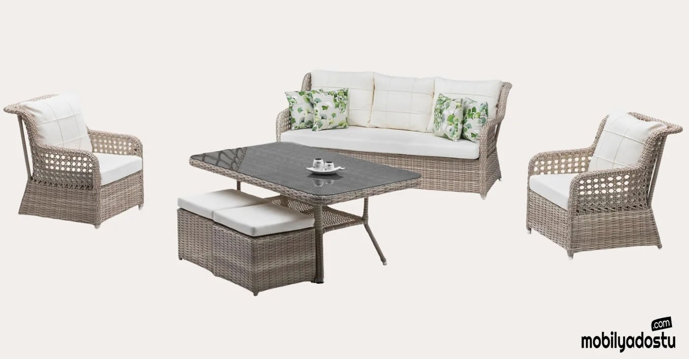 Ürünümüz: Demir Galveniz Profillerden oluşmaktadır. 1 Adet 3'Lü Koltuk, 2 Adet Tekli Koltuk, 2 Adet Puf, Masa ve 1 Adet Makrome. Bakım gerektirmez. 3 Farklı renk modeli mevcuttur. 22 DNS Sünger, | Ölçüler: Üçlü: 85×180, 85h, Masa:70×140, 71h Tekli: 65×65 85 Puf: 35x35