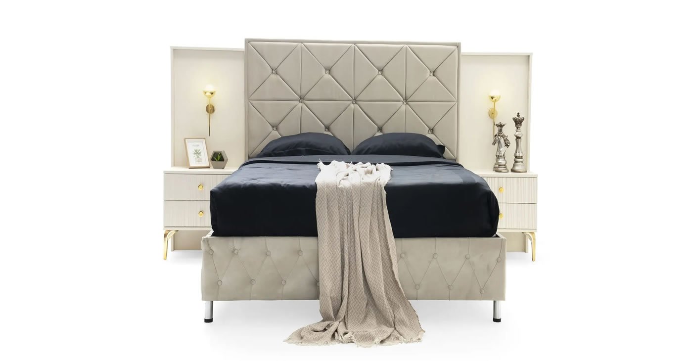 Yatak odası takımımız tamamen MDF'den üretilmiştir. Kapakları 1. sınıf membran kaplamadır. Takımın tüm kapakları CNC ve bronz ayna kullanılarak tasarlanmıştır. Dolap kapaklarında frenli menteşe kullanılmıştır. Dolap içlerinde ledli elbise askılığı kullanılmıştır. Dolap arkaları geçmeli ve 5 mm'dir. Dolap içerisinde teleskopik raylı iki adet gizli çekmece bulunmaktadır. Dolap, şifonyer ve komodinlere minfix montajı yapılmıştır. Dolap altlarında baza bulunmaktadır. Komodinler çift çekmece ve panellidir. Komodinlerde dokunmatik aplikler bulunmaktadır.